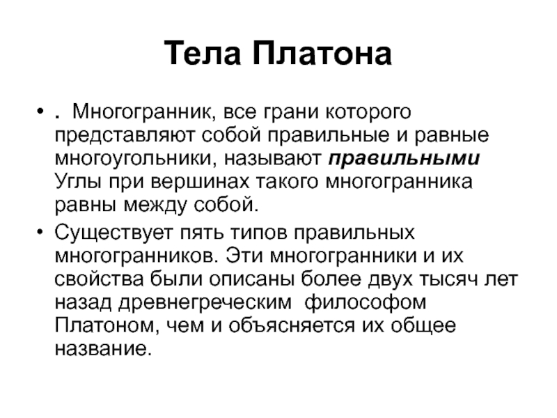 Существует пять типов правильных многогранников. Эти многогранники и их свойства были описаны более двух тысяч лет назад древнегреческим философом Платоном, чем и объясняется их общее название.