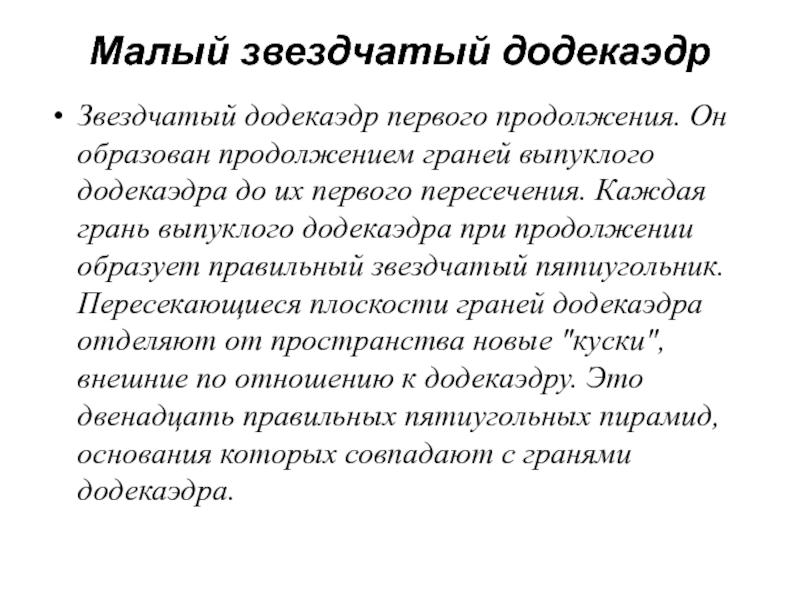 додекаэдра при продолжении образует правильный звездчатый пятиугольник. Пересекающиеся плоскости граней додекаэдра отделяют от пространства новые "куски", внешние по отношению к додекаэдру. Это двенадцать правильных пятиугольных пирамид, основания которых совпадают с гранями додекаэдра.