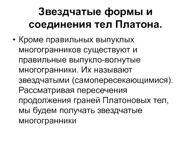 существуют и правильные выпукло-вогнутые многогранники. Их называют звездчатыми (самопересекающимися). Рассматривая