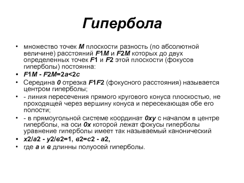 - линия пересечения прямого кругового конуса плоскостью, не проходящей через вершину конуса и пересекающая обе его полости;