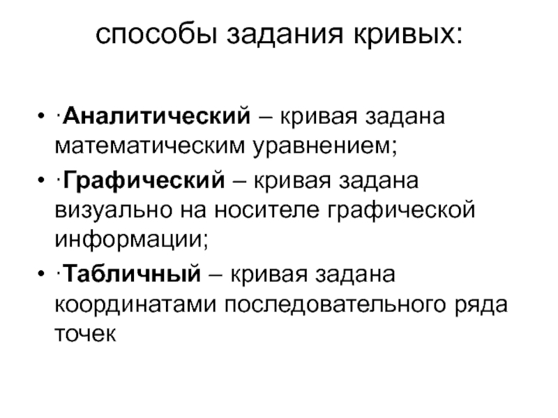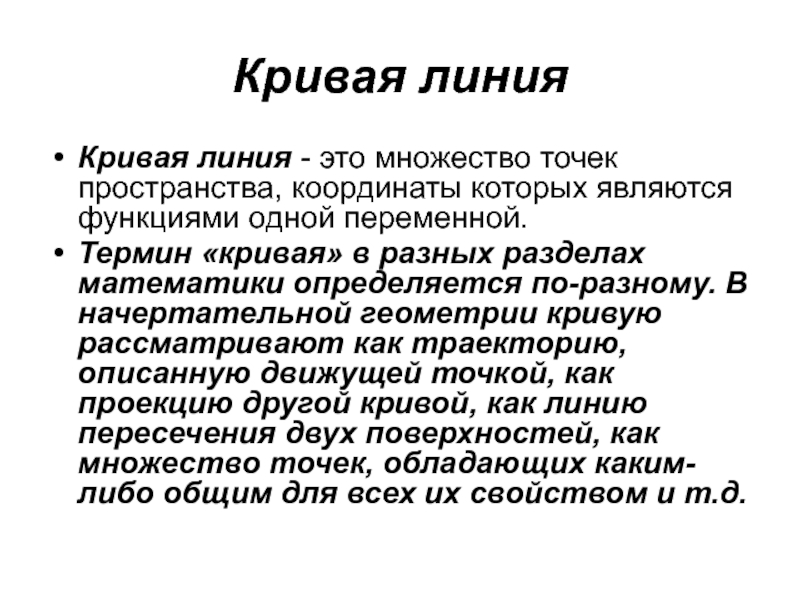 определяется по-разному. В начертательной геометрии кривую рассматривают как траекторию, описанную движущей точкой, как проекцию другой кривой, как линию пересечения двух поверхностей, как множество точек, обладающих каким-либо общим для всех их свойством и т.д.