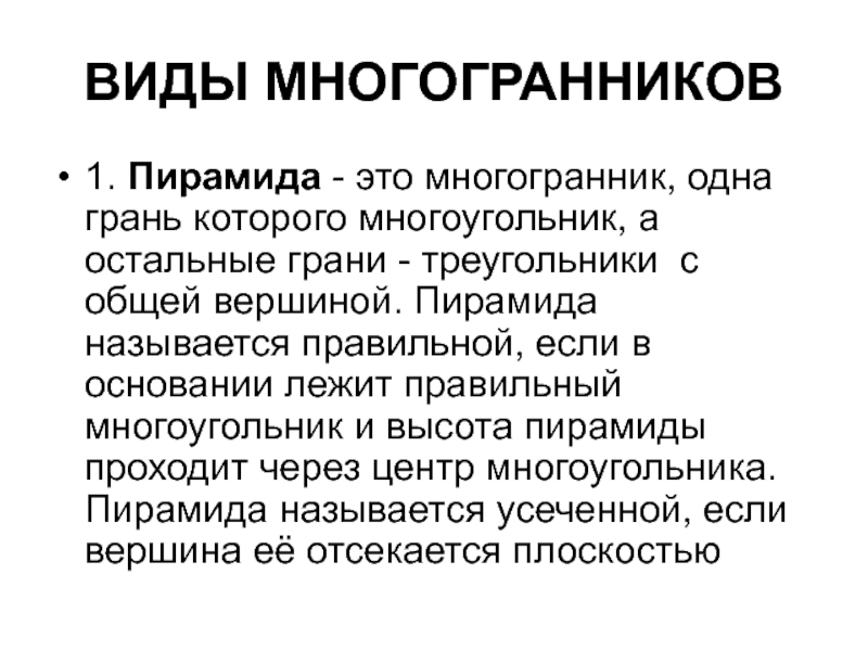 1. Пирамида - это многогранник, одна грань которого многоугольник,