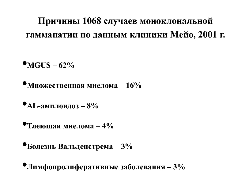 Слайд 10Причины 1068 случаев моноклональной гаммапатии по данным клиники Mейo, 2001