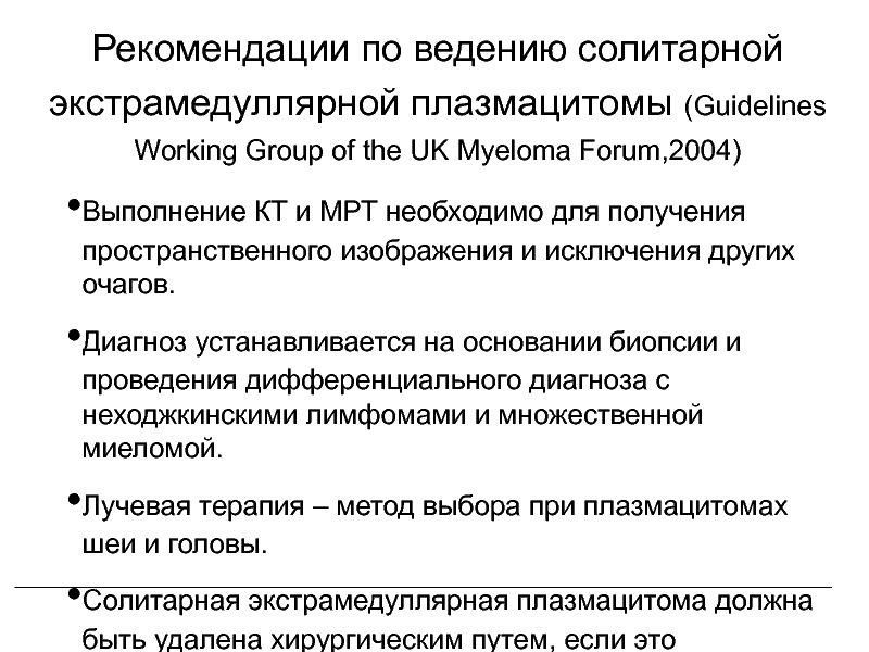 Слайд 14Рекомендации по ведению солитарной экстрамедуллярной плазмацитомы (Guidelines Working Group of