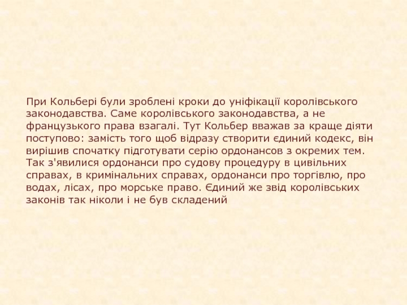 Слайд 14При Кольбері були зроблені кроки до уніфікації королівського законодавства. Саме