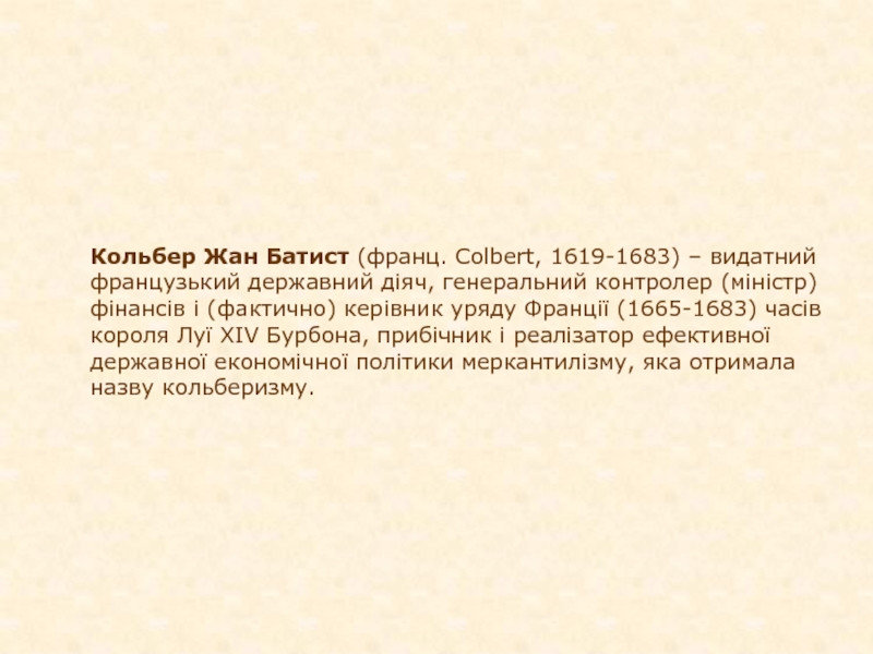 Слайд 3Кольбер Жан Батист (франц. Colbert, 1619-1683) – видатний французький державний діяч, генеральний