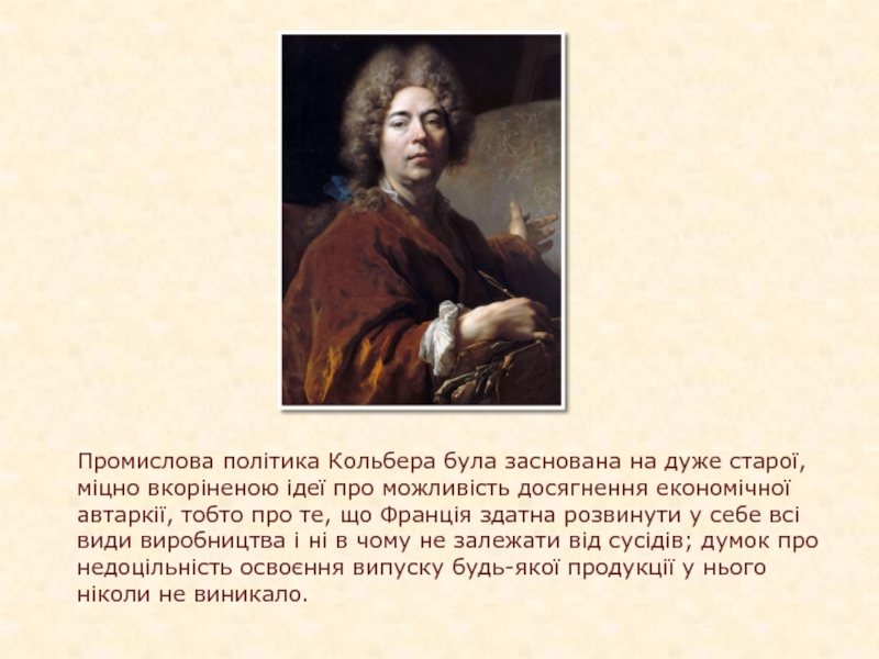 Слайд 16Промислова політика Кольбера була заснована на дуже старої, міцно вкоріненою