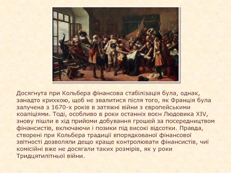 Слайд 12Досягнута при Кольбера фінансова стабілізація була, однак, занадто крихкою, щоб