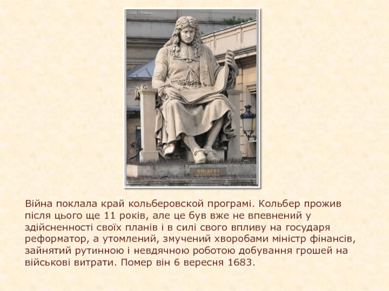 Слайд 18Війна поклала край кольберовской програмі. Кольбер прожив після цього ще