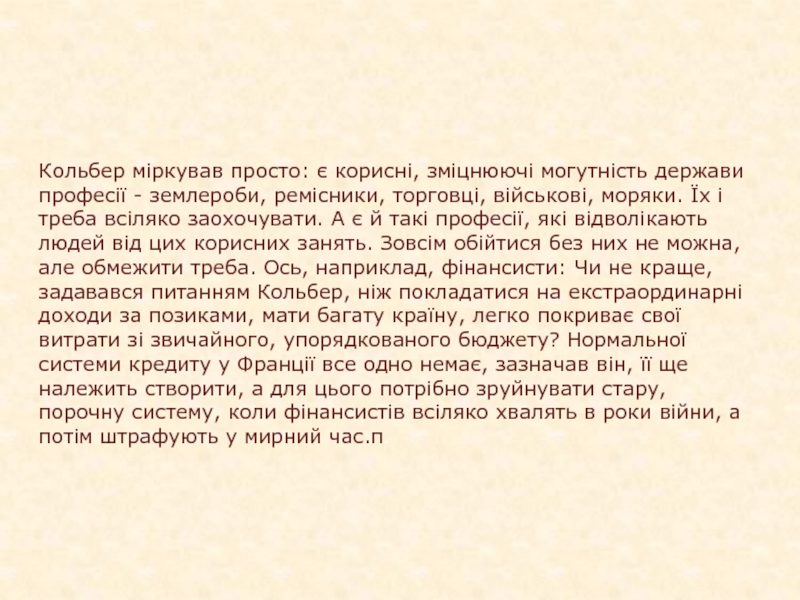 Слайд 8Кольбер міркував просто: є корисні, зміцнюючі могутність держави професії -