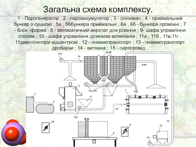 , 5ббункера приймальні ; 6а , 6б - бункера проміжні ; 7 - блок -форма ; 8 - автоматичний верстат для різання ; 9- шафа управління столом ; 10 - шафа управління ділянкою вспенівнія ; 11а , 11б , 11в.11г , 11двентілятори відцентрові ; 12 - пневмотранспорт ; 13 - пневмотранспорт дробарки ; 14 - витяжка ; 15 - паропровід .