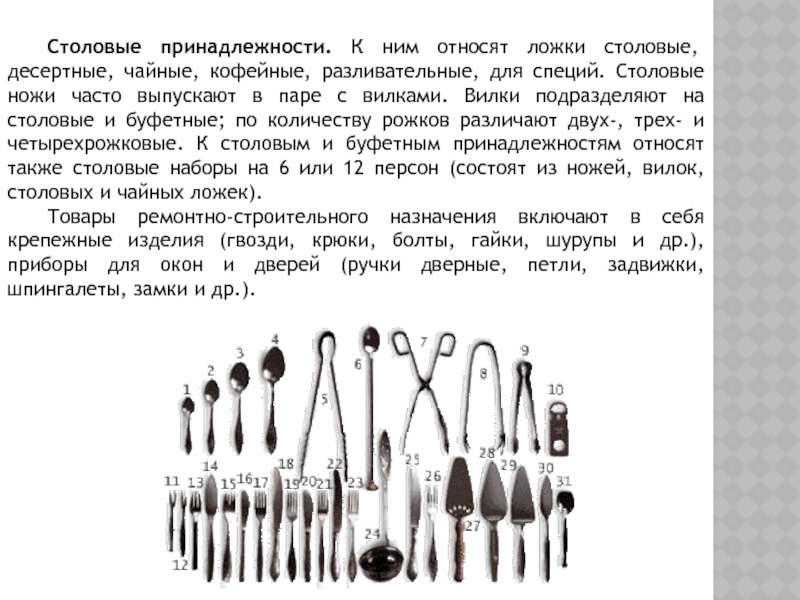 Слайд 10Столовые принадлежности. К ним относят ложки столовые, десертные, чайные, кофейные,