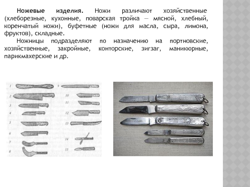 Слайд 8Ножевые изделия. Ножи различают хозяйственные (хлеборезные, кухонные, поварская тройка —