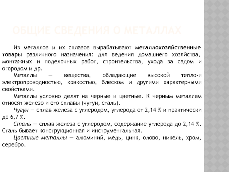 Металлы условно делят на черные и цветные. К черным металлам относят железо и его сплавы (чугун, сталь).