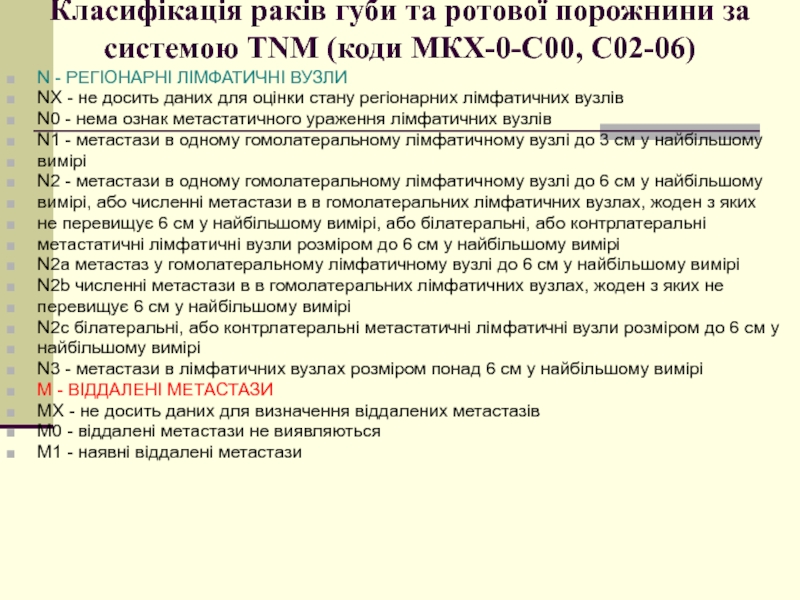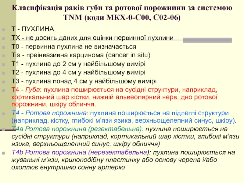 Слайд 10Класифікація раків губи та ротової порожнини за системою TNM (коди