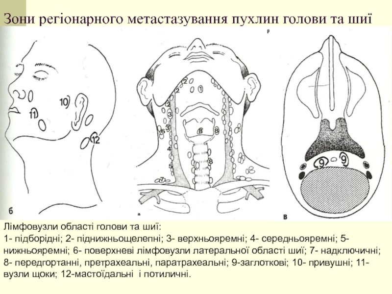 поверхневі лімфовузли латеральної області шиї; 7- надключичні; 8- передгортанні, претрахеальні, паратрахеальні; 9-заглоткові; 10- привушні; 11- вузли щоки; 12-мастоїдальні і потиличні.