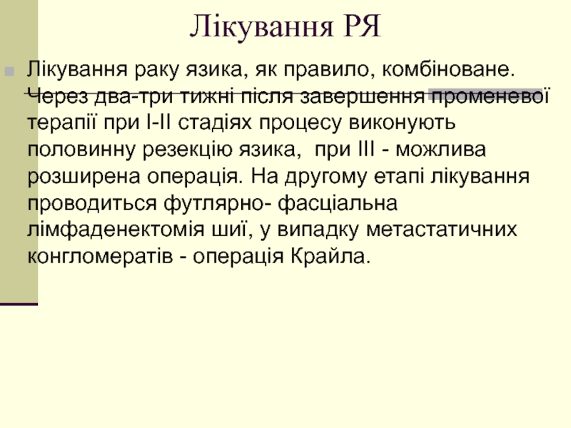 резекцію язика, при III - можлива розширена операція. На другому етапі лікування проводиться футлярно- фасціальна лімфаденектомія шиї, у випадку метастатичних конгломератів - операція Крайла.