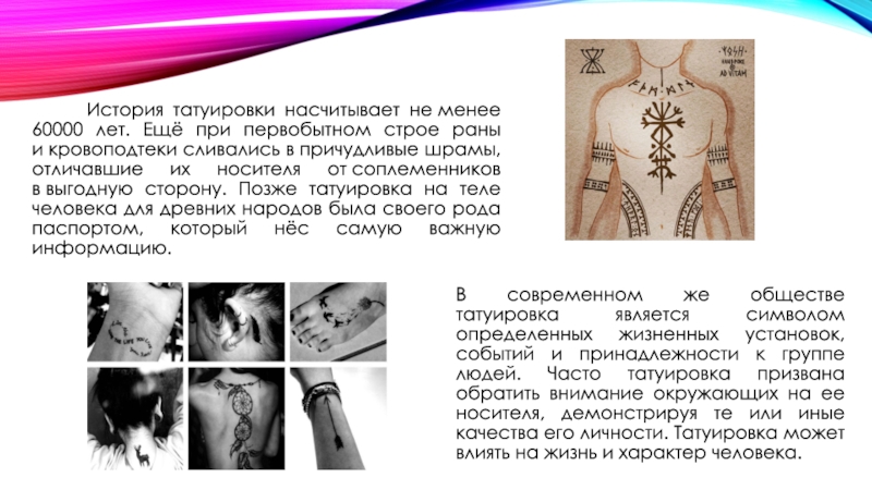В современном же обществе татуировка является символом определенных жизненных установок, событий и принадлежности к группе людей. Часто татуировка призвана обратить внимание окружающих на ее носителя, демонстрируя те или иные качества его личности. Татуировка может влиять на жизнь и характер человека.