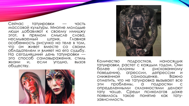 Количество подростков, наносящих татуировки, растет с каждым годом. Они более склонны к рискованному поведению, агрессии, депрессии и сниженной самооценке. Важно отметить, что не татуировка вызывает все эти проблемы, а подростки с определенными склонностями делают тату чаще. Среди психологов даже появилось такое понятие как тату-зависимость.