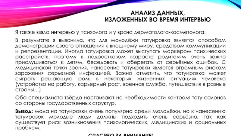 Актуальность. В современном обществе мода на татуировки стала очень популярной, особенно среди молодежи. К сожалению, часто подростки легкомысленно относятся к нанесению татуировок и не задумываются о том, что это может привести к определенным проблемам. В России тату-индустрия никем не контролируется и, в связи с этим, часто возникают риски медицинского характера, а также появляются проблемы в социальной сфере.