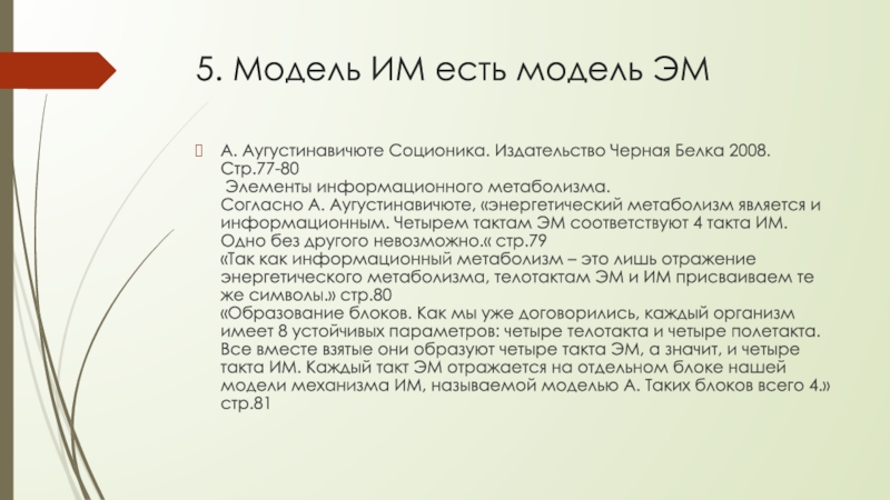 «Образование блоков. Как мы уже договорились, каждый организм имеет 8 устойчивых параметров: четыре телотакта и четыре полетакта. Все вместе взятые они образуют четыре такта ЭМ, а значит, и четыре такта ИМ. Каждый такт ЭМ отражается на отдельном блоке нашей модели механизма ИМ, называемой моделью А. Таких блоков всего 4.» стр.81