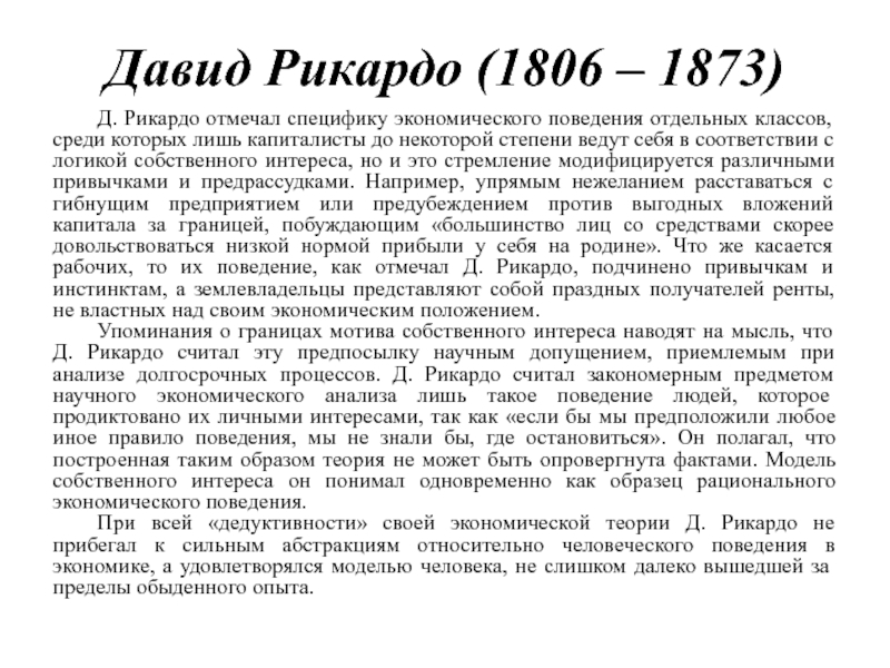 себя в соответствии с логикой собственного интереса, но и это стремление модифицируется различными привычками и предрассудками. Например, упрямым нежеланием расставаться с гибнущим предприятием или предубеждением против выгодных вложений капитала за границей, побуждающим «большинство лиц со средствами скорее довольствоваться низкой нормой прибыли у себя на родине». Что же касается рабочих, то их поведение, как отмечал Д. Рикардо, подчинено привычкам и инстинктам, а землевладельцы представляют собой праздных получателей ренты, не властных над своим экономическим положением.