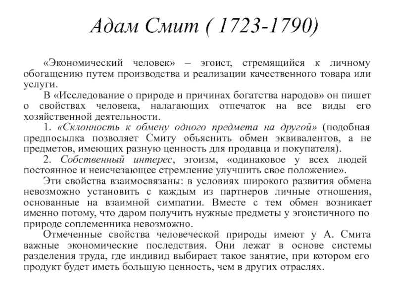 о природе и причинах богатства народов» он пишет о свойствах человека, налагающих отпечаток на все виды его хозяйственной деятельности.