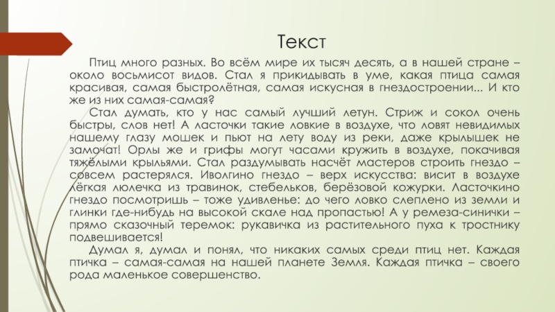 Текст Птиц много разных. Во всём мире их тысяч десять, а в нашей стране – около восьмисот видов. Стал я прикидывать в уме, какая птица самая красивая, самая быстролётная, самая искусная