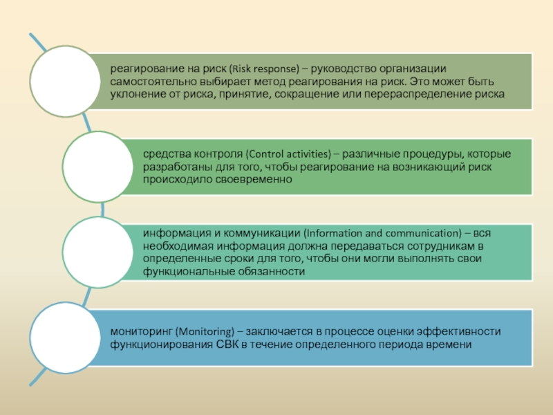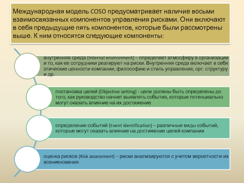 Международная модель COSO предусматривает наличие восьми взаимосвязанных компонентов управления рисками. Они включают в себя предыдущие пять