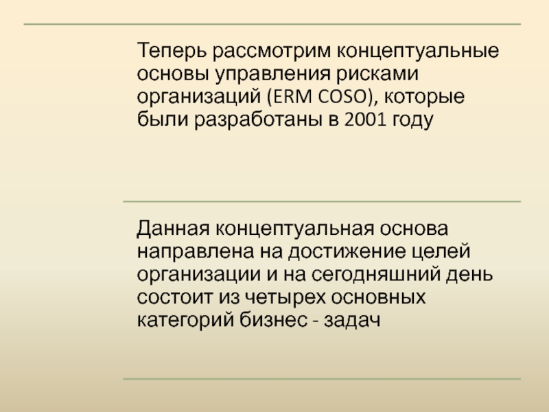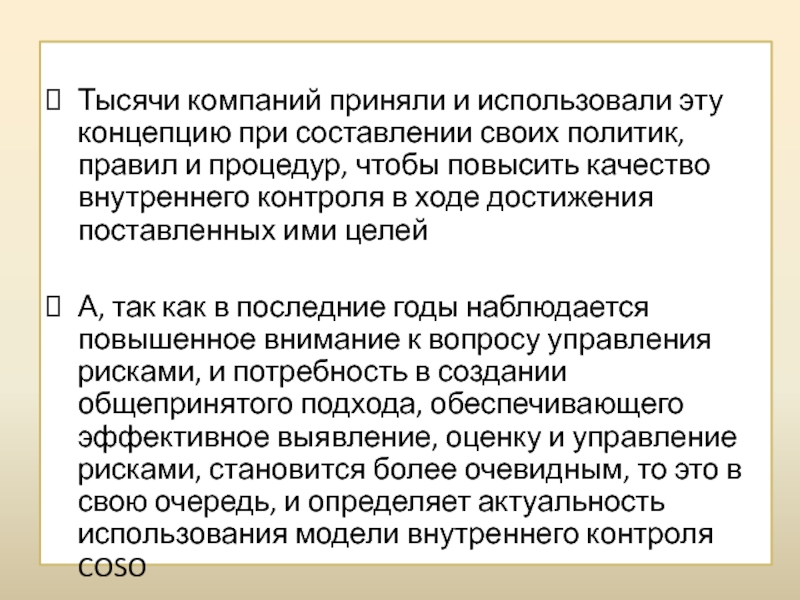 А, так как в последние годы наблюдается повышенное внимание к вопросу управления рисками, и потребность в создании общепринятого подхода, обеспечивающего эффективное выявление, оценку и управление рисками, становится более очевидным, то это в свою очередь, и определяет актуальность использования модели внутреннего контроля COSO