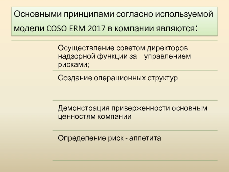 Слайд 16Основными принципами согласно используемой модели COSO ERM 2017 в компании