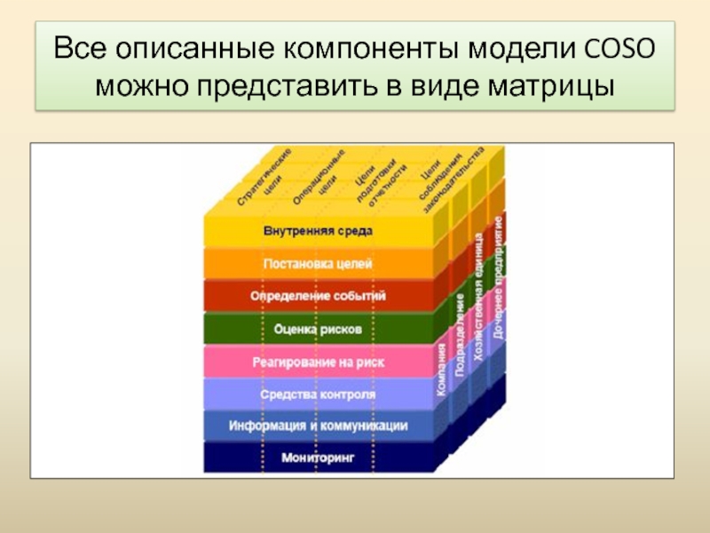 Слайд 13Все описанные компоненты модели COSO можно представить в виде матрицы