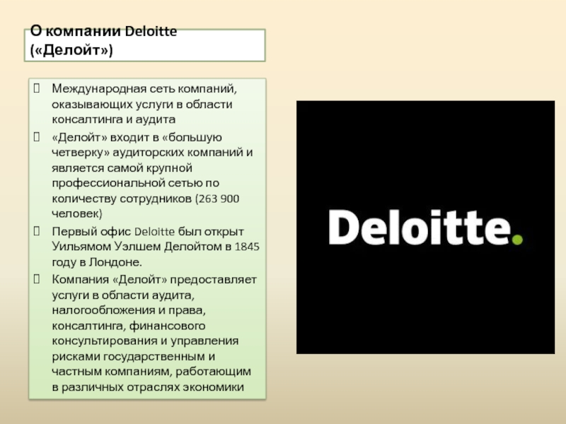 О компании Deloitte («Делойт»)Международная сеть компаний, оказывающих услуги в области консалтинга и аудита«Делойт» входит в «большую четверку»