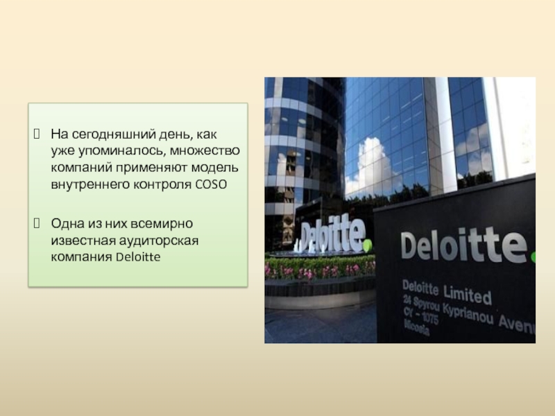 На сегодняшний день, как уже упоминалось, множество компаний применяют модель внутреннего контроля COSOОдна из них всемирно известная
