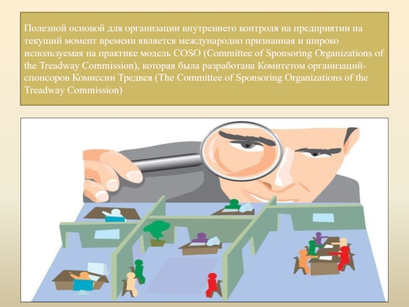 Полезной основой для организации внутреннего контроля на предприятии на текущий момент времени является международно признанная и широко используемая на практике модель COSO (Committee of Sponsoring Organizations of the Treadway Commission), которая