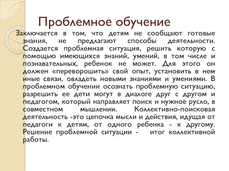 помощью имеющихся знаний, умений, в том числе и познавательных, ребенок не может. Для этого он должен «переворошить» свой опыт, установить в нем иные связи, овладеть новыми знаниями и умениями. В проблемном обучении осознать проблемную ситуацию, разрешить ee дети могут в диалоге друг с другом и педагогом, который направляет поиск и нужное русло, в совместном мышлении. Коллективно-поисковая деятельность -это цепочка мысли и действия, идущая от педагоги к детям, от однoгo ребенка - к другому. Решение проблемной ситуации - итог коллективной работы.