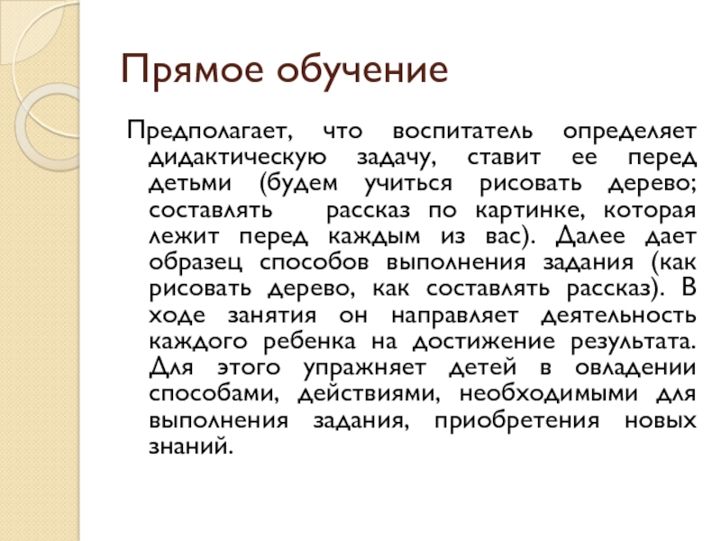 Прямое обучениеПредполагает, что воспитатель определяет дидактическую задачу, ставит ее перед детьми (будем учиться рисовать дерево; составлять
