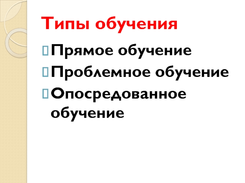 Типы обученияПрямое обучение Проблемное обучение Опосредованное обучение