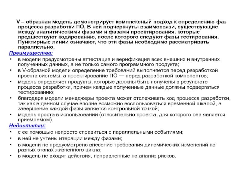 модель определяет продукты, которые должны быть получены в результате процесса разработки, причем каждые полученные данные должны подвергаться тестированию;