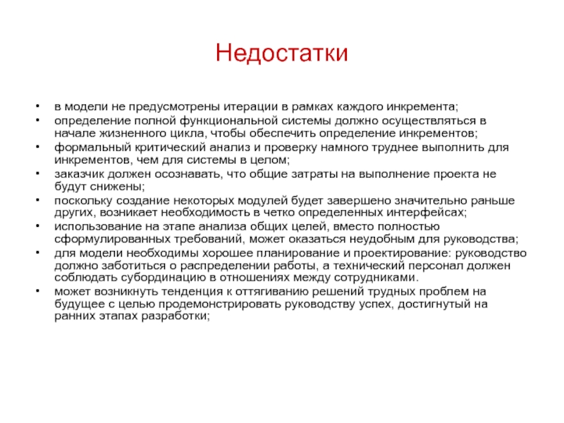 формальный критический анализ и проверку намного труднее выполнить для инкрементов, чем для системы в целом;
