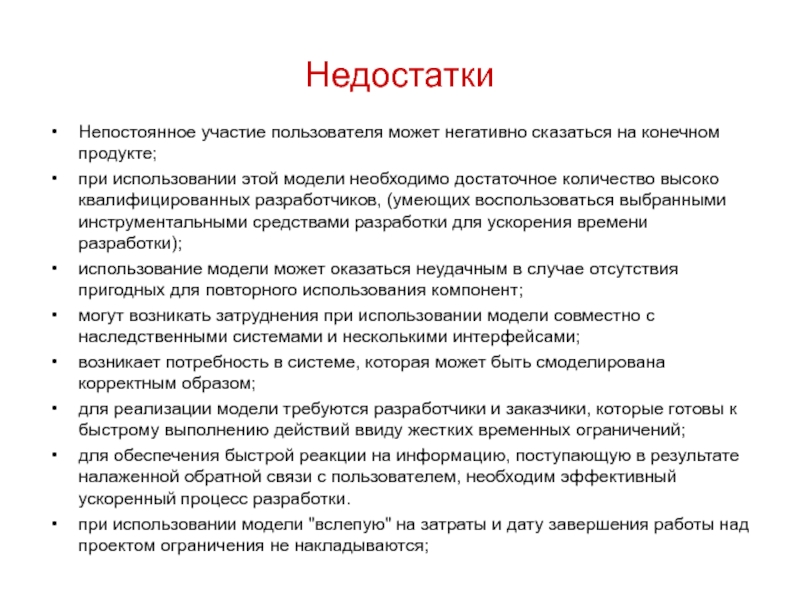 использовании этой модели необходимо достаточное количество высококвалифицированных разработчиков, (умеющих воспользоваться