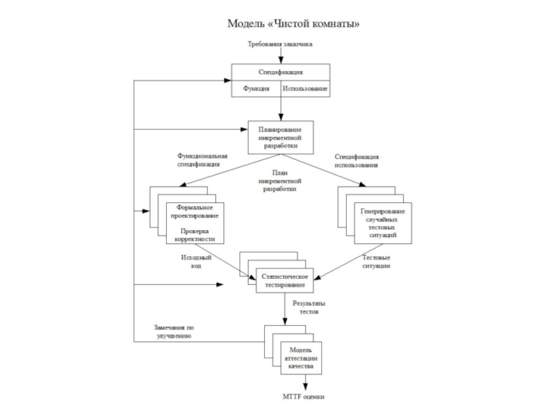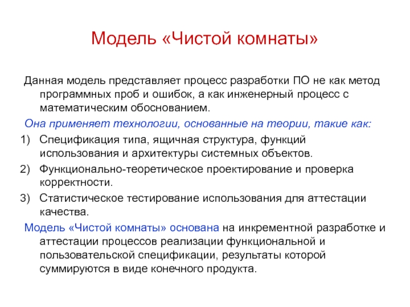 Модель «Чистой комнаты» основана на инкрементной разработке и аттестации процессов реализации функциональной и пользовательской спецификации, результаты которой суммируются в виде конечного продукта.