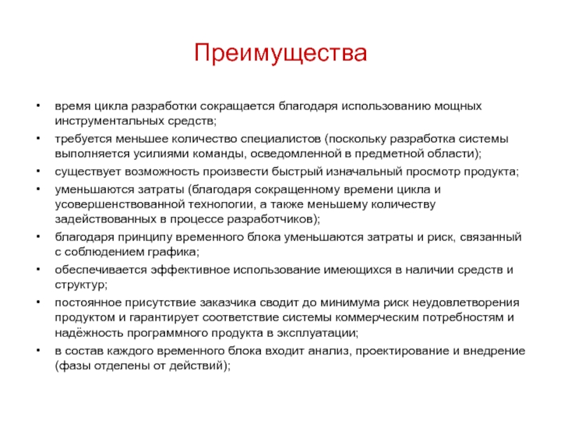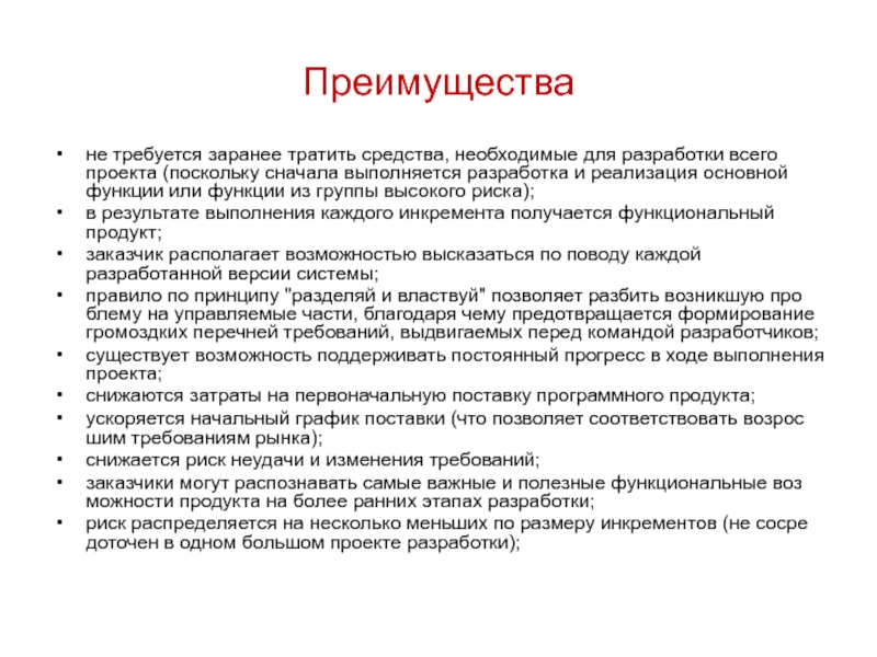 риск распределяется на несколько меньших по размеру инкрементов (не сосредоточен в одном большом проекте разработки);