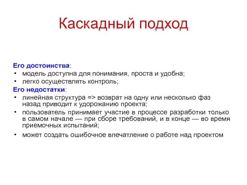 пользователь принимает участие в процессе разработки только в самом начале — при сборе требований, и в конце — во время приемочных испытаний;
