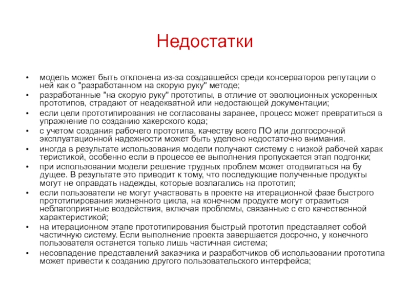 с учетом создания рабочего прототипа, качеству всего ПО или долгосрочной эксплуатационной надежности может быть уделено недостаточно внимания.