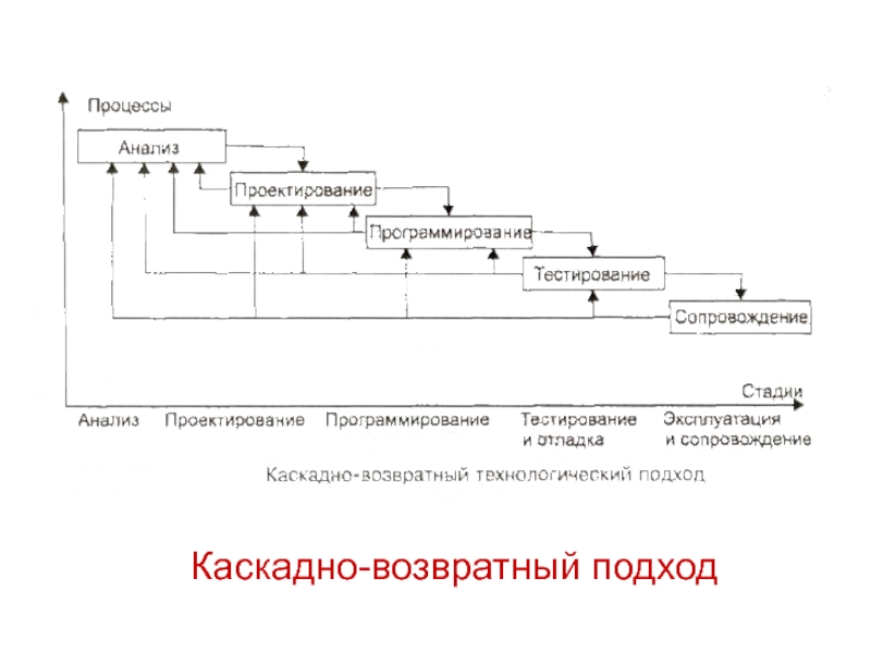 подчеркнуты взаимосвязи, существующие между аналитическими фазами и фазами проектирования, которые предшествуют кодированию, после которого следуют фазы тестирования. Пунктирные линии означают, что эти фазы необходимо рассматривать параллельно.