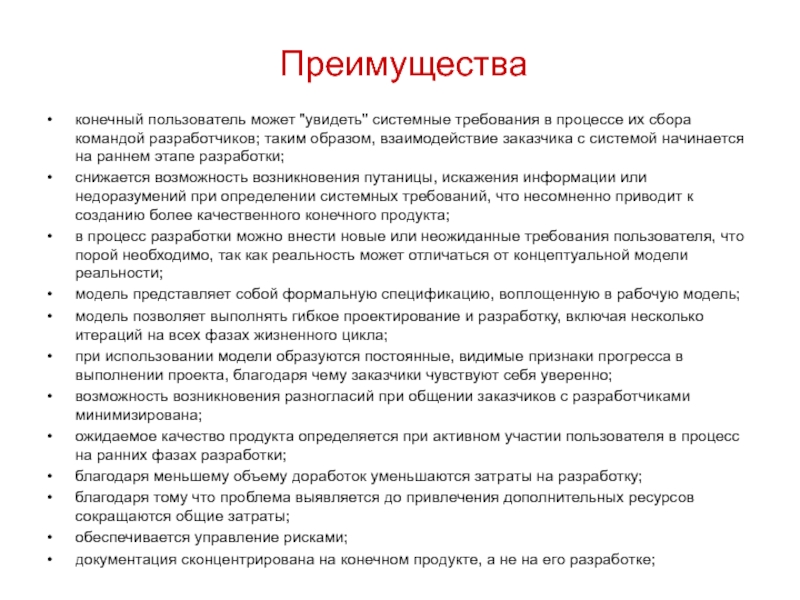 в процесс разработки можно внести новые или неожиданные требования пользователя, что порой необходимо, так как реальность может отличаться от концептуальной модели реальности;