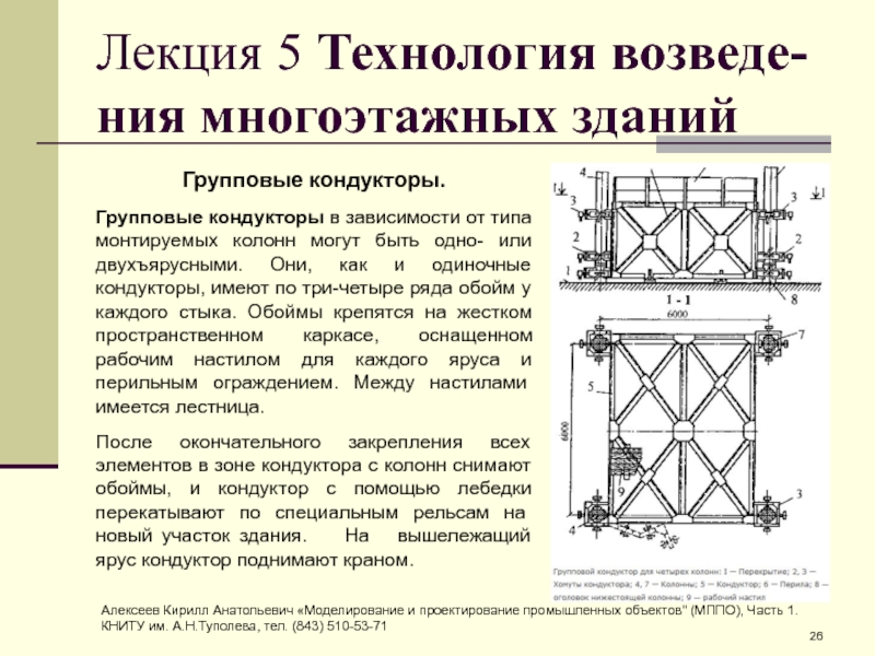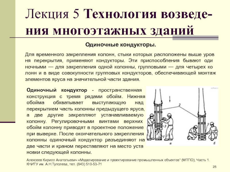 Одиночный кондуктор - пространственная конструкция с тремя рядами обойм. Нижняя обойма обхватывает выступающую над перекрытием часть колонны предыдущего яруса, а две другие закрепляют устанавливаемую колонну. Регулировочными винтами верхних обойм колонну приводят в проектное положение при выверке. После окончательного закрепления колонны одиночный кондуктор разъединяют на две части и краном переставляют на место установки следующей колонны.