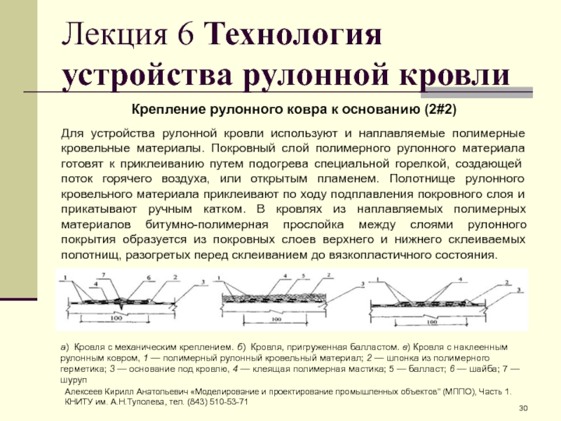 а) Кровля с механическим креплением. б) Кровля, пригруженная балластом. в) Кровля с наклеенным рулонным ковром, 1 — полимерный рулонный кровельный материал; 2 — шпонка из полимерного герметика; 3 — основание под кровлю, 4 — клеящая полимерная мастика; 5 — балласт; 6 — шайба; 7 — шуруп