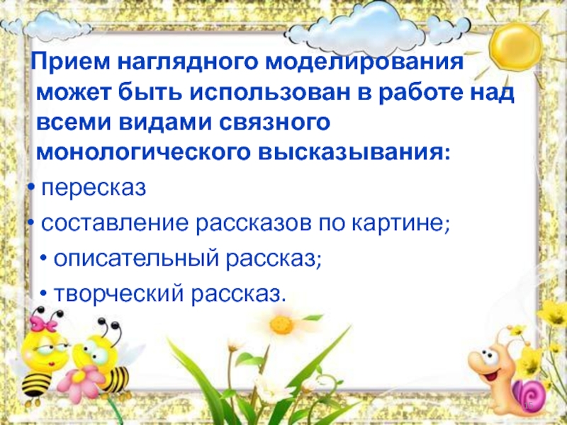 Слайд 15Прием наглядного моделирования может быть использован в работе над всеми